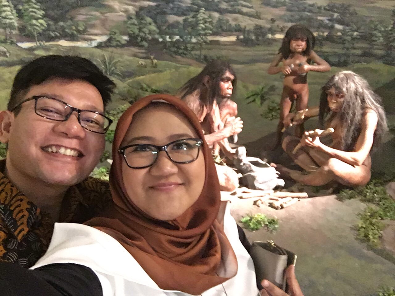 Karena kami ini siap banget bajunya, a.k.a pulang kondangan, jadilah nyempetin foto dgn latar diorama manusia jaman dahulu kala. Errhhh pas foto sih ga berasa apa-apa karena fokusnya saya pikir ke dua orang di depan, yang pake baju rapih…. tapi setelah beberapa hari kemudian mulai ngerasa janggal, kenapa itu 3 patung di belakang kita ngga pake baju, hahaha!