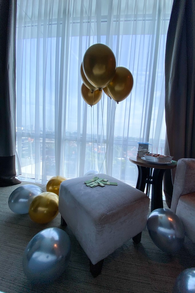 Today, the 43rd of my living chance on this earth, here it goes… balloons were floated in the hotel room. Never had in mind to stay in a hotel at this end year time, but here I am.